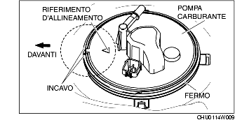 1. Allineare i riferimenti della pompa carburante con l'incavo del fermo come mostrato in figura.