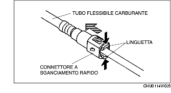 1. Premere le linguette sul connettore a sganciamento rapido e scollegare il tubo flessibile dal tubo rigido del carburante.