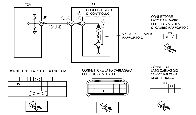 • Controllare la continuità tra il terminale 2V (lato cablaggio) del TCM e il terminale H (lato cablaggio) del connettore dell'elettrovalvola AT.