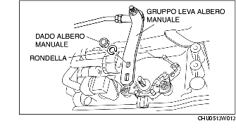 12. Rimuovere la rondella e il gruppo leva albero manuale.